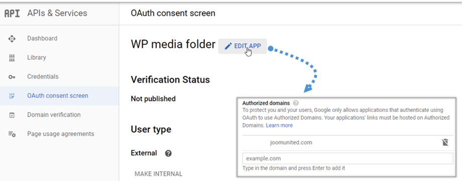 Google ได้เปลี่ยนนโยบายเมื่อเร็วๆ นี้ ดังนั้นคุณต้องกรอก โดเมนที่ได้รับอนุญาต ที่ แท็บหน้าจอคำยินยอม OAuth > แก้ไขแอป