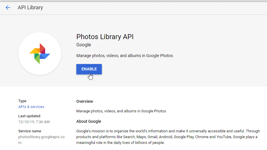 หากนี่เป็นครั้งแรกที่คุณใช้ Photos Library API คุณจะต้องเปิดใช้งาน