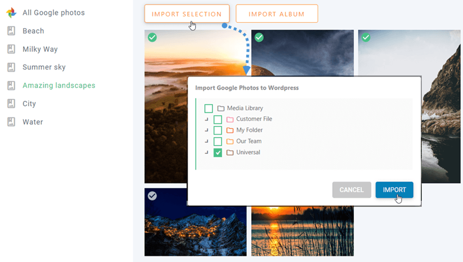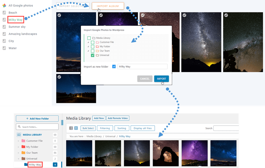 ด้วย WP Media Folder Addon คุณสามารถนำเข้าอัลบั้มใน Google Photos เป็นโฟลเดอร์ในไลบรารีสื่อ เมื่อคุณคลิกที่อัลบั้มใดๆ บน Google Photos ปุ่ม นำเข้าอัลบั้ม จะปรากฏขึ้น จากนั้นกดที่ปุ่มนั้น หลังจากนั้น เลือกตำแหน่งที่จะวางโฟลเดอร์ จากนั้นเปลี่ยนชื่อโฟลเดอร์หรือปล่อยให้เป็นชื่ออัลบั้ม สุดท้ายให้คลิกที่ ปุ่ม นำเข้า และโฟลเดอร์ใหม่จะถูกสร้างขึ้นในสื่อ