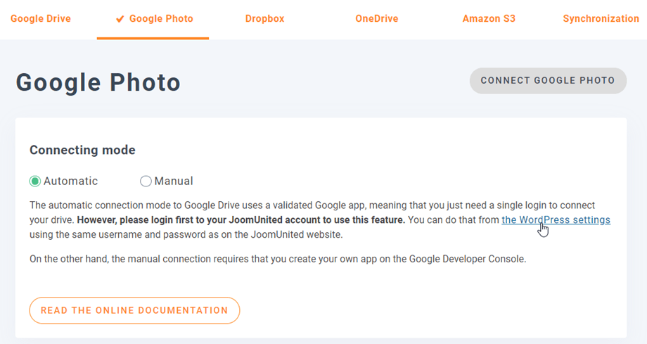 จากนี้ไป คุณจะประหยัดเวลาได้มากในขณะที่เชื่อมต่อกับเซิร์ฟเวอร์ของ Google ขั้นแรก ในการใช้คุณสมบัตินี้ คุณต้องเชื่อมโยงบัญชี Joomunited ของคุณที่ การตั้งค่าเมนู > ทั่วไป โปรดคลิกลิงก์การตั้งค่า WordPress หากคุณยังไม่ได้เชื่อมต่อ