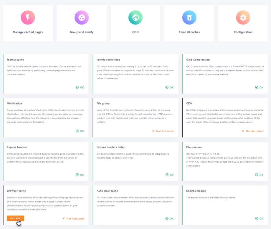 แดชบอร์ดจะตรวจสอบปัญหาด้านประสิทธิภาพและการปรับปรุงทั้งหมดที่คุณสามารถใช้บนเว็บไซต์ Joomla ของคุณ พารามิเตอร์ทั้งหมด ยกเว้นแคชของเบราว์เซอร์ สามารถแก้ไขได้ในคลิกเดียวโดยใช้ปุ่ม แก้ไขทันที