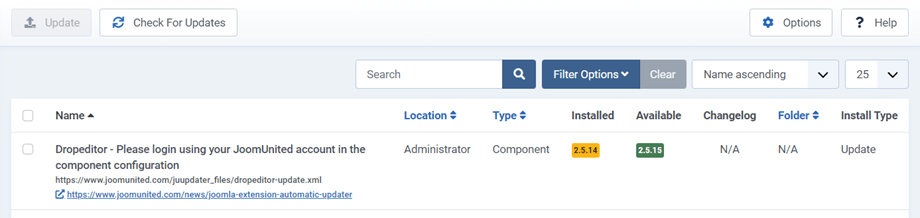 ในการอัปเดตส่วนขยาย คุณสามารถติดตั้งเวอร์ชันใหม่ทับเวอร์ชันเก่าได้โดยดาวน์โหลดไฟล์ ZIP จาก JoomUnited หรือ ใช้ตัวอัปเดตอัตโนมัติ (แนะนำ)