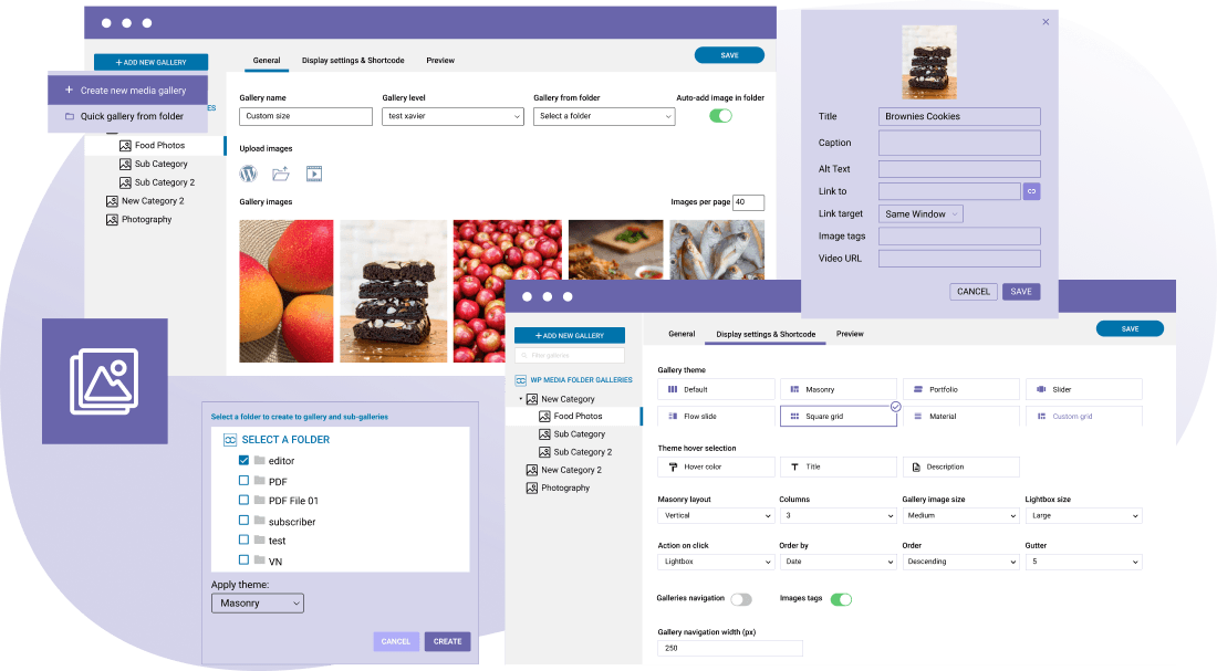 | 来自媒体文件夹的画廊您现在可以像在WordPress中一样从任何文件夹创建画廊,但使用4个可用的设计主题之一。每个主题都有多个显示选项 | ||
